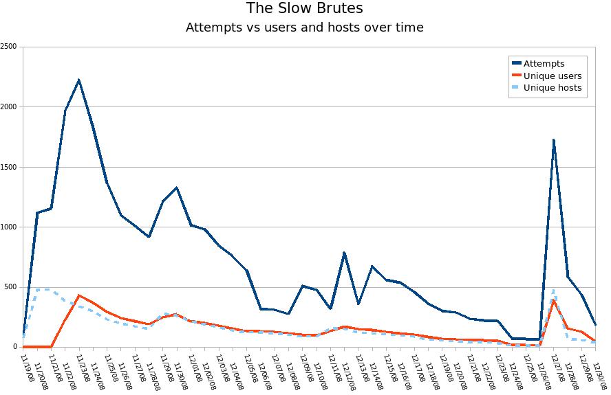 The full collection of raw data is available here, with a .csv summarising number of attempts, user names and hosts per day here.